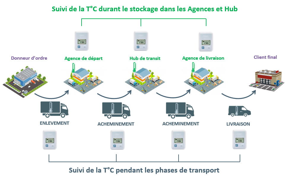 The entire courier network in France has been equipped with almost 2,000 LoRa SPY Digital temperature recorders with protective casings. Installed in vehicles and branches, they guarantee complete traceability of the temperature of parcels requiring monitoring: from the time they are picked up from the customer/shipper, during the various transit phases in branches and during all stages of transport right up to delivery to the recipient.